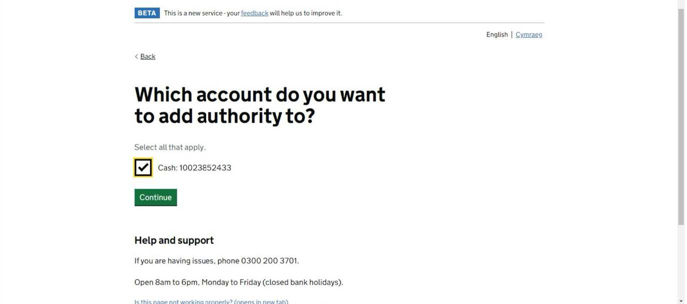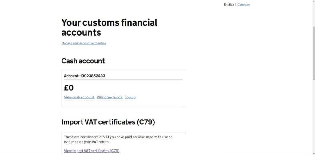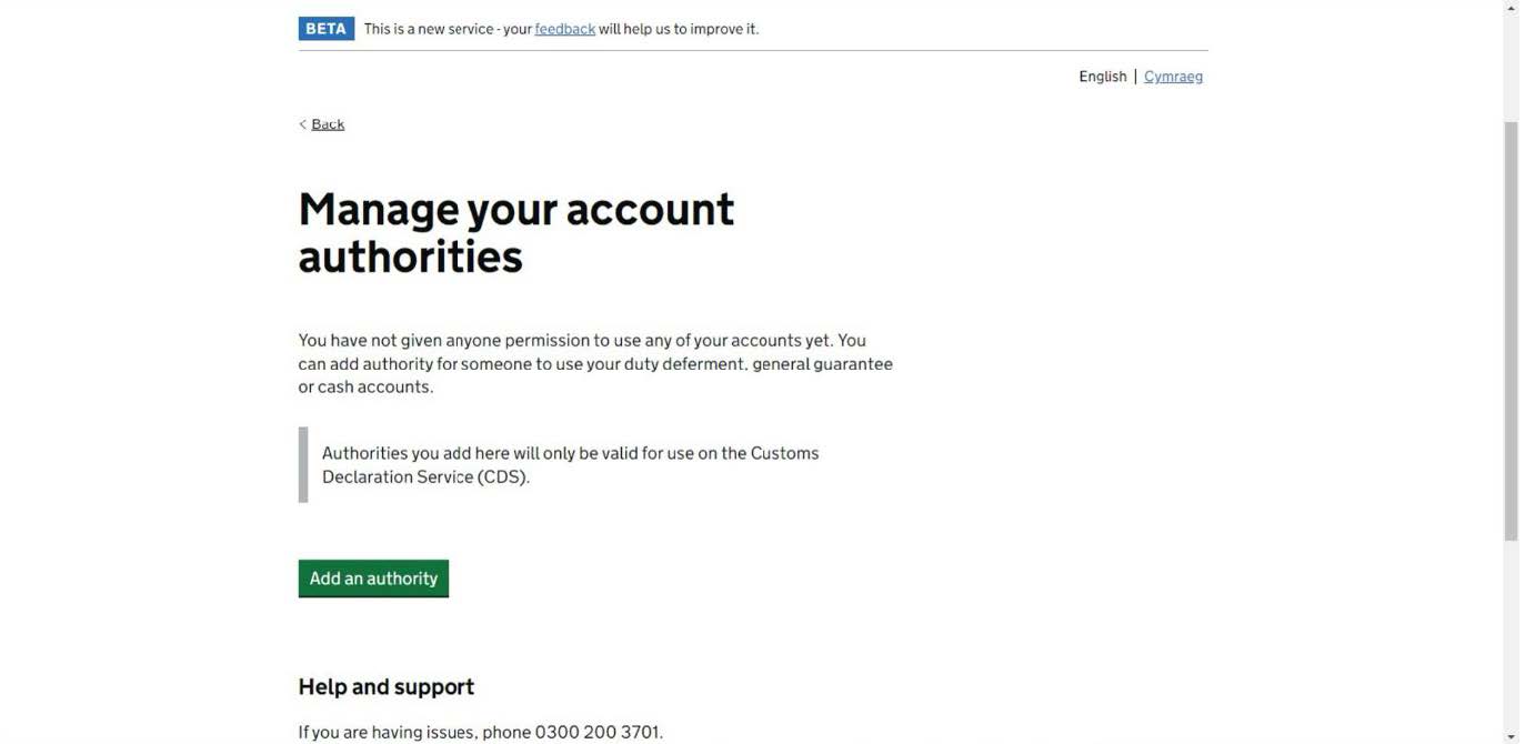On this screen, you will see under “Your customs financial accounts” a link showing “Manage your account Authorities”